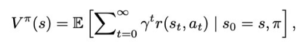 다음 수식은 보상 함수를 구성하는 벨만 방정식으로, State S에서 정책 파이에 따라 행동 A를 취했을 때의 누적 보상합을 나타낸다.