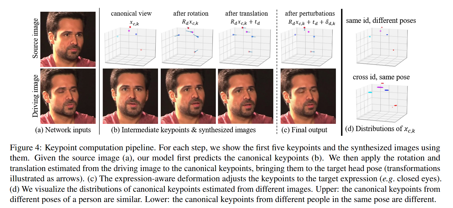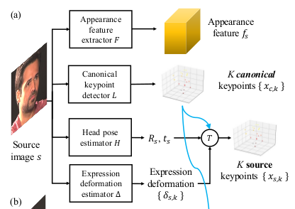 - Source Image Keypoint x_{s,k}를 계산 (Image specific and contain personal signature, pose, and expression information)