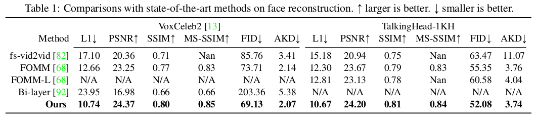 - Talking Head Image Synthesis : 평가 지표로나, 정성적으로나 기존 sota 모델들보다 좋은 성능을 보였다.