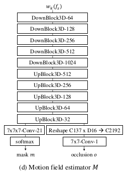 → 총 20개의 warping된 3D feature $w_k(f_s)$를 얻게 되고, concatenate하여 Motion Field Estimator $M$에 입력값으로 넣어준다.