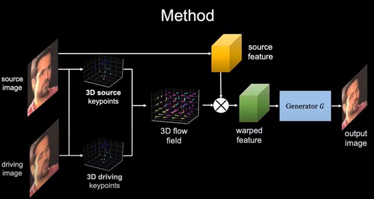 - 단 한 장의 source image와 driving video만으로도 자연스럽게 말하고 움직이는 얼굴 영상을 생성할 수 있는 one-shot 합성 기법을 제안,