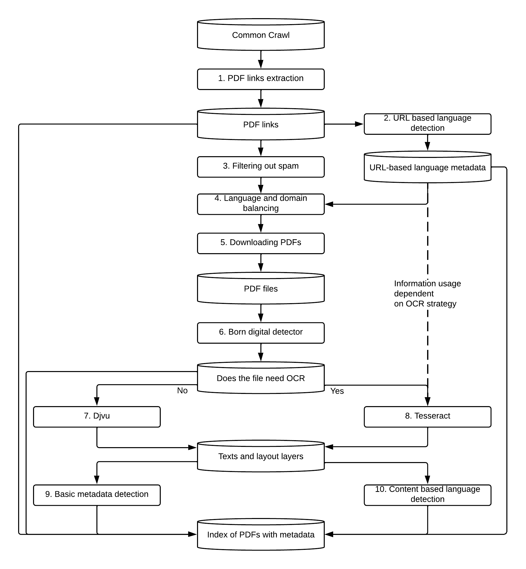 - PDF 처리 pipeline의 최초 step 중 하나는 URL-based language detection method