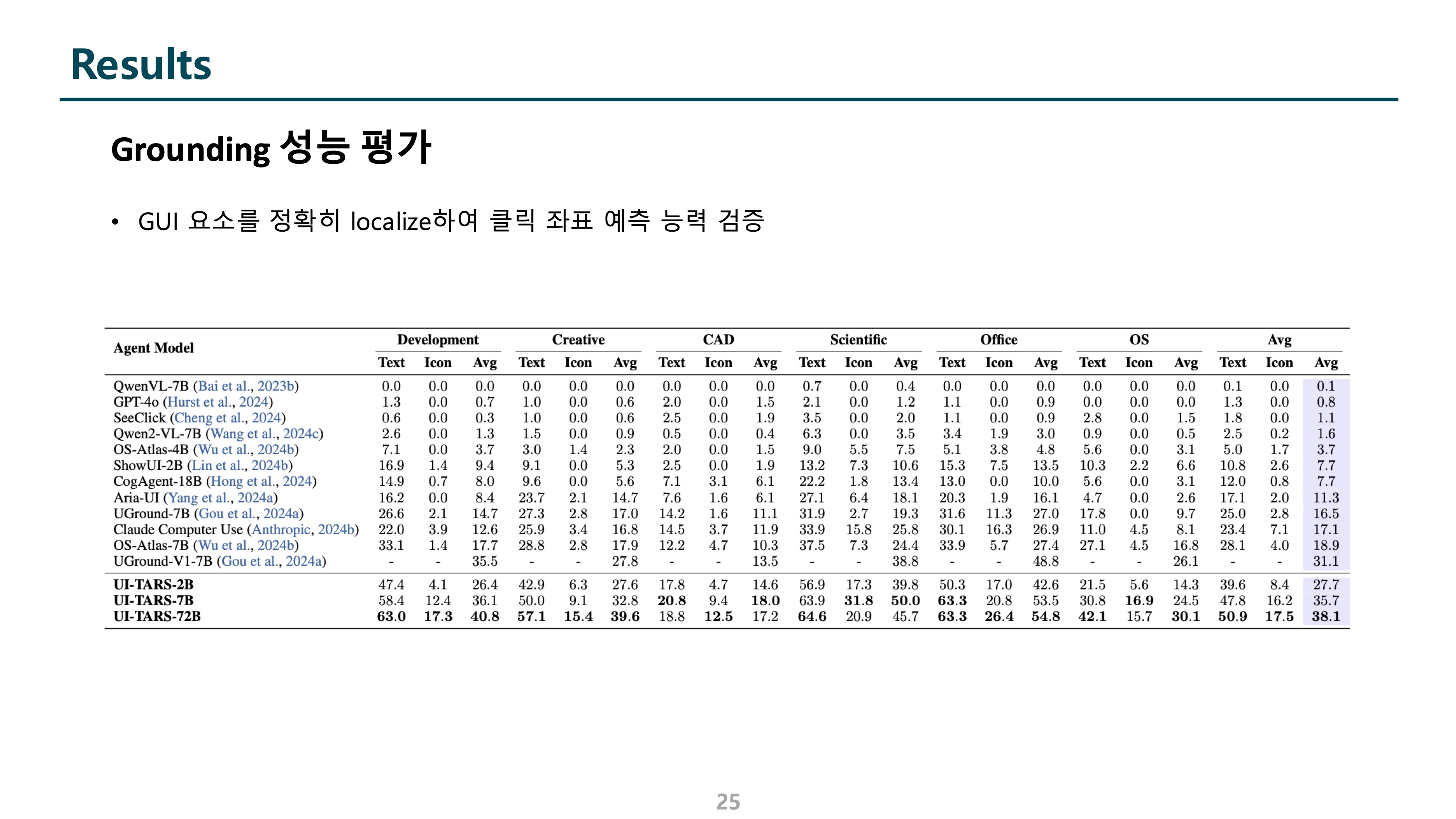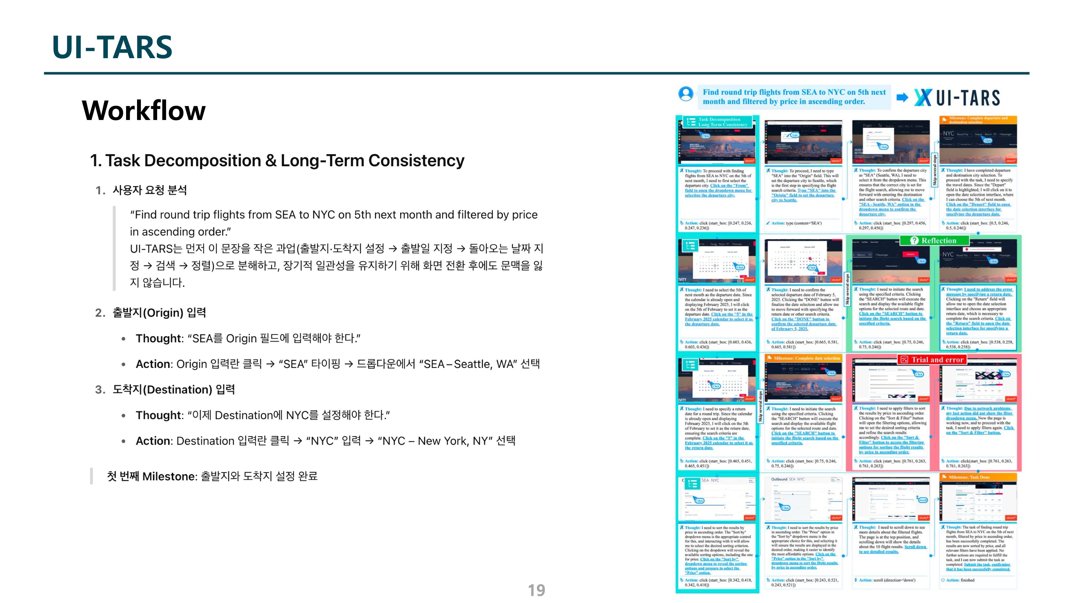 Multi-Modal [2025-2] 백승우 - UI-TARS: Pioneering Automated GUI Interaction with Native Agents BaekDaBang 2025. 7. 30. 13:29 UI-TARS: Pioneering Automated GUI Interaction with Native Agents This paper introduces UI-TARS, a native GUI agent model that solely perceives the screenshots as input and performs human-like interactions (e.g., keyboard and mouse operations). Unlike prevailing agent frameworks that depend on heavily wrapped commercial arxiv.org