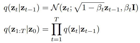 - 확산 모델은 T 단계에 걸쳐 초기 실제 데이터 z0 ~ q(z)에 가우시안 노이즈 샘플을 추가하여 순방향(forward) 확산 프로세스 q의 Markov chain을 정의함.