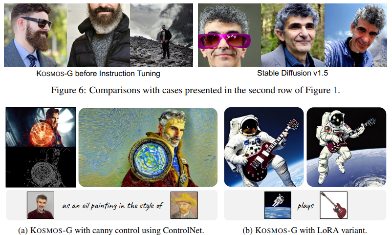 - Figure 7에서는 ControlNet와 LoRA 변형과의 통합을 보여줌. KOSMOS-G는 이러한 기술과 완벽하게 작동함.