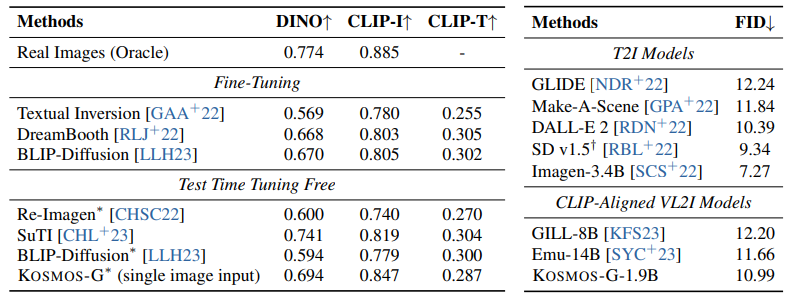 - 새로운 구성 생성 명령어 튜닝 덕분에 제로샷 설정에서 이를 달성할 수 있는 모델은 KOSMOS-G가 처음임.