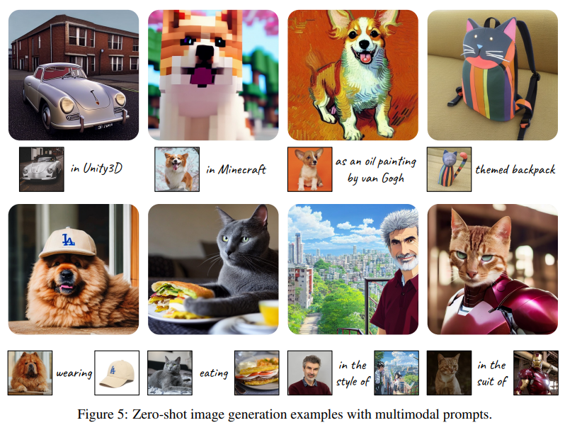 Figure 1 KOSMOS-G는 입력된 이미지를 “외국어”로 간주하며 여러 이미지를 포함하는 일반화된 비전-언어 입력을 이해하고 이미지를 생성하는 능력을 가지고 있음.