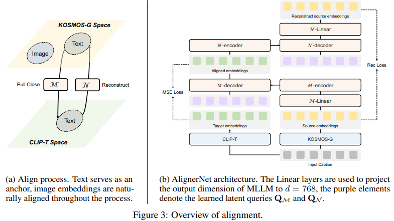 - AlignerNet은 인코더 M과 디코더 N으로 구성되어 KOSMOS-G의 소스 공간 S과 CLIP 텍스트 인코더의 대상 공간 T 간의 정렬을 학습하며, 텍스트 소스 임베딩과 대상 임베딩 간의 거리를 최소화하여 정렬을 수행함.