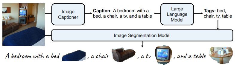 Figure 4 데이터 구축 파이프라인: 필요한 데이터를 구축하기 위해 먼저 이미지에 캡션을 추가하고, 캡션에서 개체를 추출하고 이미지에서 분할 결과를 얻음.