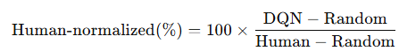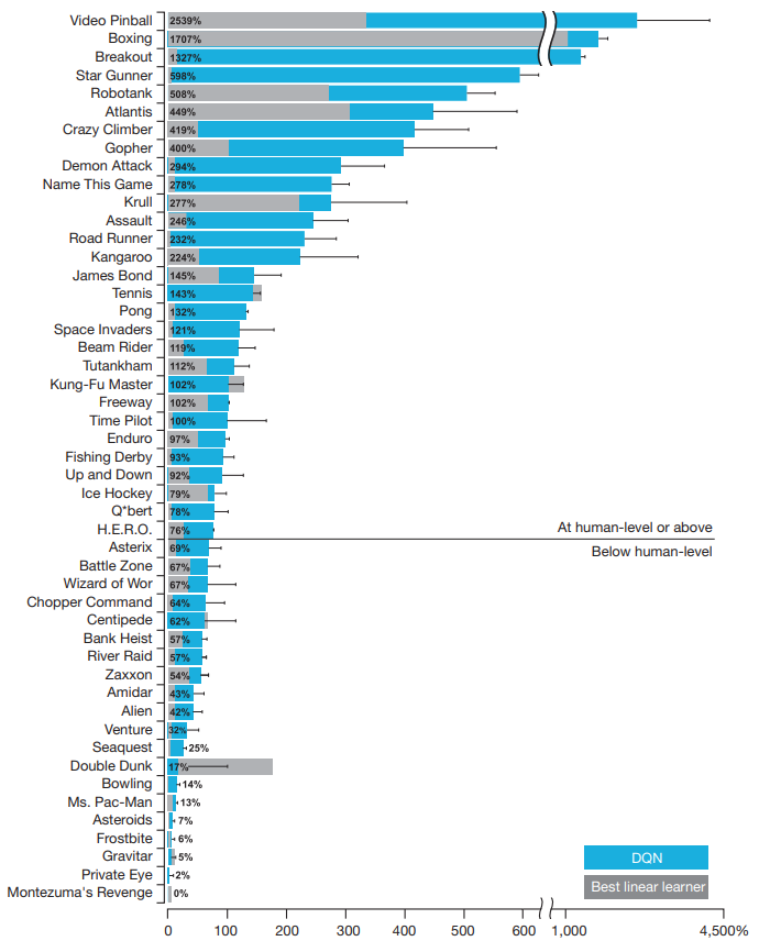 각 게임에서 DQN이 랜덤(0%)과 인간 전문가(100%) 사이에서 어느 수준인지 보여줌. 또한 기존 최고 선형함수근사법과 비교.