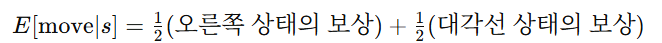 move를 선택하면 벨만 방정식에 따라 계산된다. 이동 후 도달 가능한 상태들의 확률과 그 상태의 기대 보상을 합산하여 구한다.