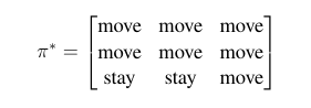 즉, 대부분의 상태에서는 move가 최적 행동이지만, 용암 지역으로 떨어질 위험이 큰 일부 상태에서는 stay가 더 나은 선택이 된다.