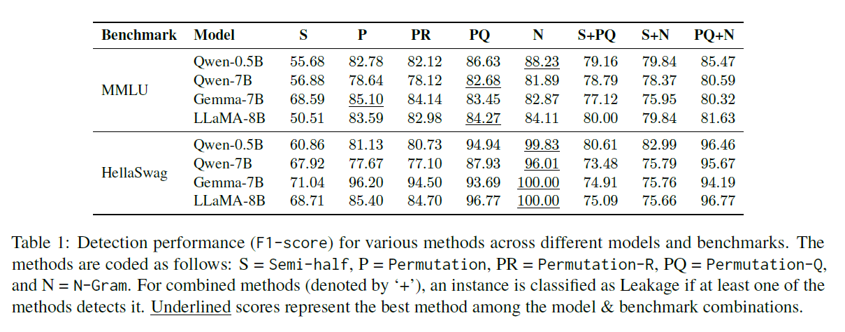 Table 1은 다양한 모델과 방법에 대한 데이터 누출 감지 성능 (F1-score)을 비교한 표입니다. 각 방법은 Semi-half (S), Permutation (P), Permutation-R (PR), Permutation-Q (PQ), N-Gram (N) 등을 포함하며, 이들 각각의 방법이 MMLU와 HellaSwag 데이터셋에 대해 어떻게 성능을 발휘하는지를 보여줍니다. 주요 내용: