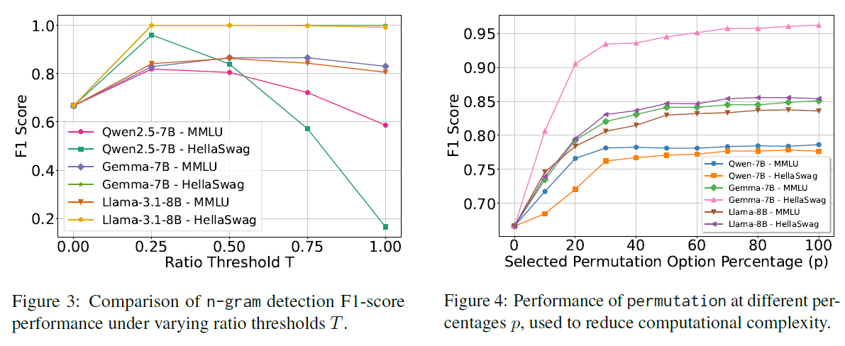X축: 선택지 순서 비율(p) 여기서 p는 Permutation 방법에서 사용할 순서 설정의 비율을 의미합니다. 예를 들어, p = 1.0이면 모든 가능한 순서를 다 계산하는 것이고, p = 0.5이면 순서 설정의 절반만 계산합니다. Y축: F1-score (모델 성능) F1-score는 모델이 데이터 누출을 얼마나 정확하게 감지하는지 평가하는 지표입니다. Figure 3: N-gram 방법의 임계값 T에 따른 F1-score 변화는 n-gram 방법의 성능을 측정하기 위한 실험 결과를 보여줍니다. 이 실험에서는 임계값(T)을 변경하면서 모델의 성능(여기서는 F1-score)이 어떻게 변하는지를 관찰합니다. N-gram 방법이란?먼저 n-gram 방법을 간단히 설명하겠습니다.n-gram 방법은 주어진 문장이나 선택지가 훈련 데이터와 얼마나 유사한지 측정하는 방법입니다. n-gram은 문장을 n개의 연속된 단어들로 분할하여 유사성을 판단합니다. 예를 들어 아래 bi-gram, tri-gram을 봅시다.