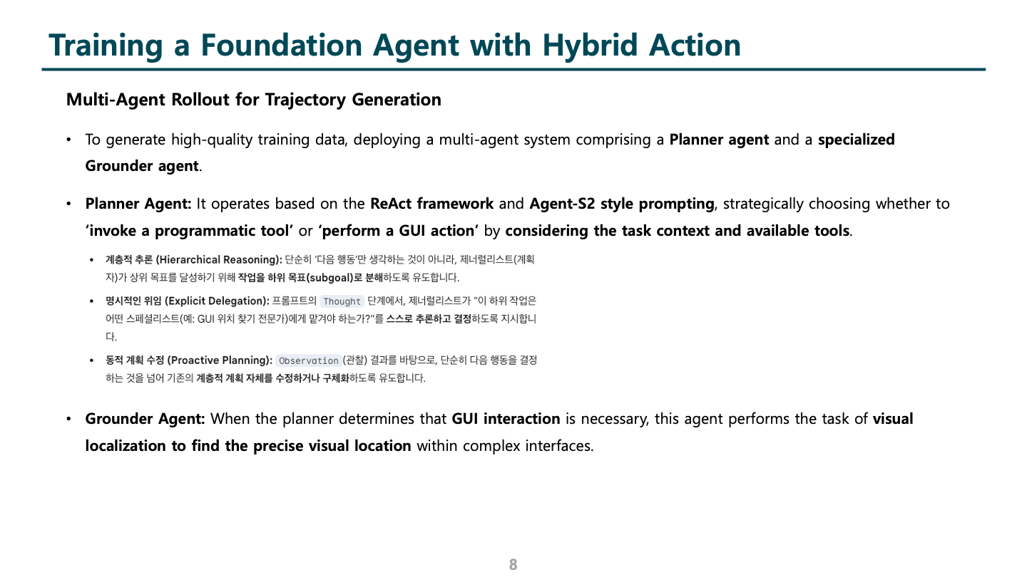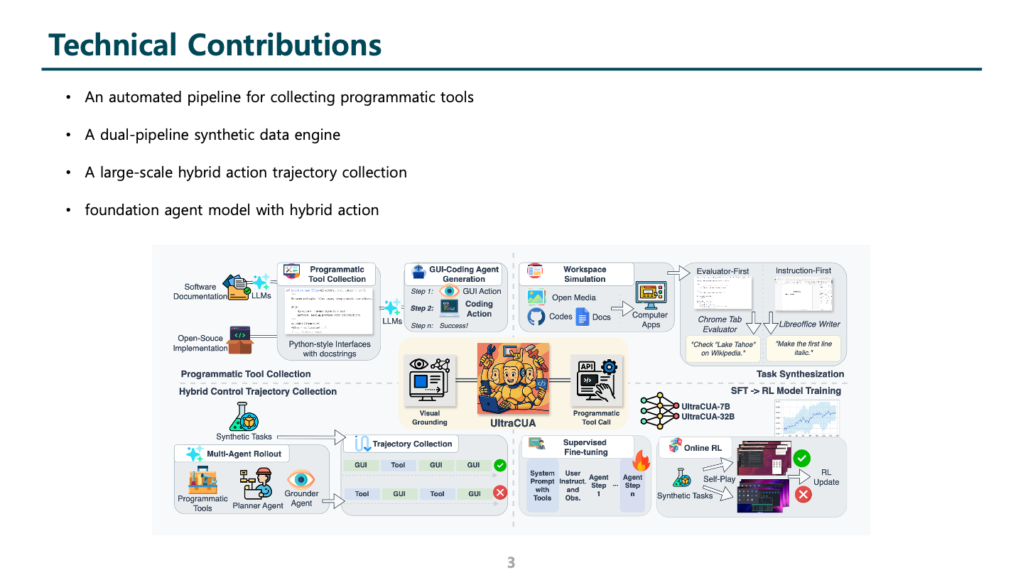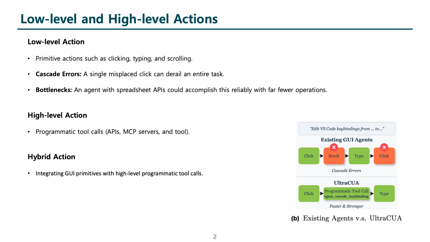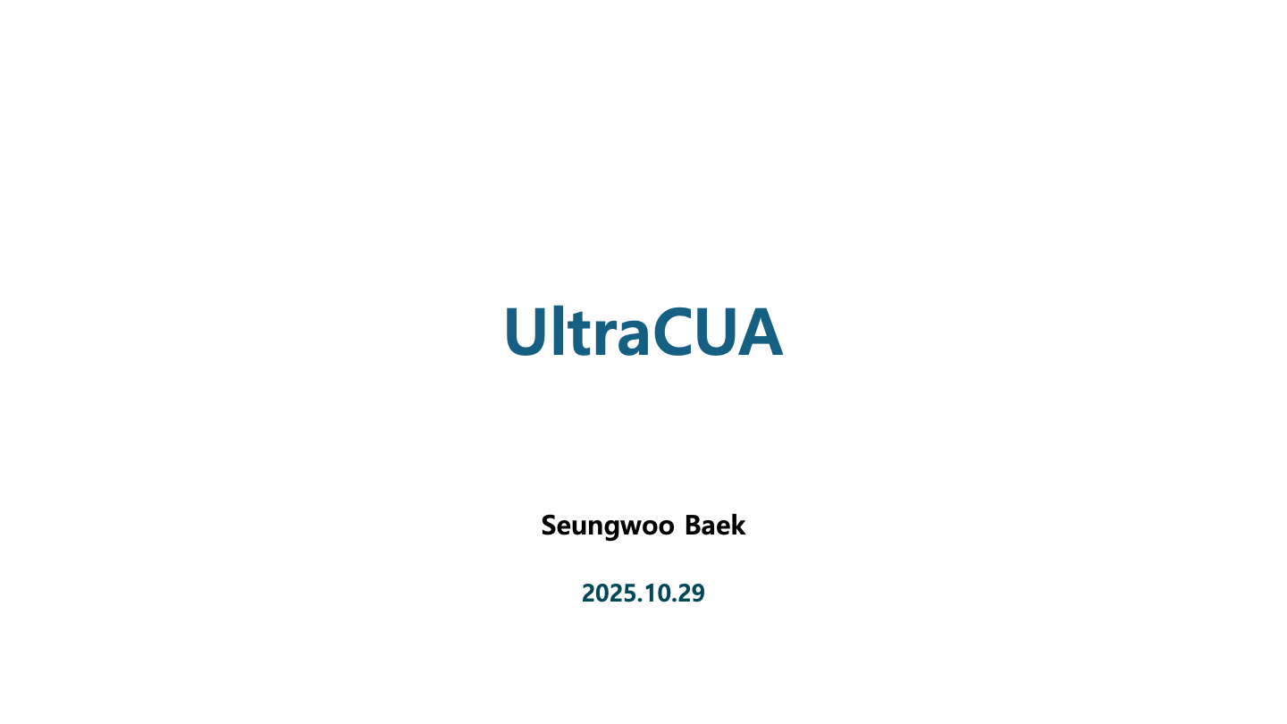 Multi-Modal [2025-2] 백승우 - UltraCUA: A Foundation Model for Computer Use Agents with Hybrid Action BaekDaBang 2025. 10. 29. 14:29 UltraCUA: A Foundation Model for Computer Use Agents with Hybrid Action Multimodal agents for computer use rely exclusively on primitive actions (click, type, scroll) that require accurate visual grounding and lengthy execution chains, leading to cascading failures and performance bottlenecks. While other agents leverage rich arxiv.org