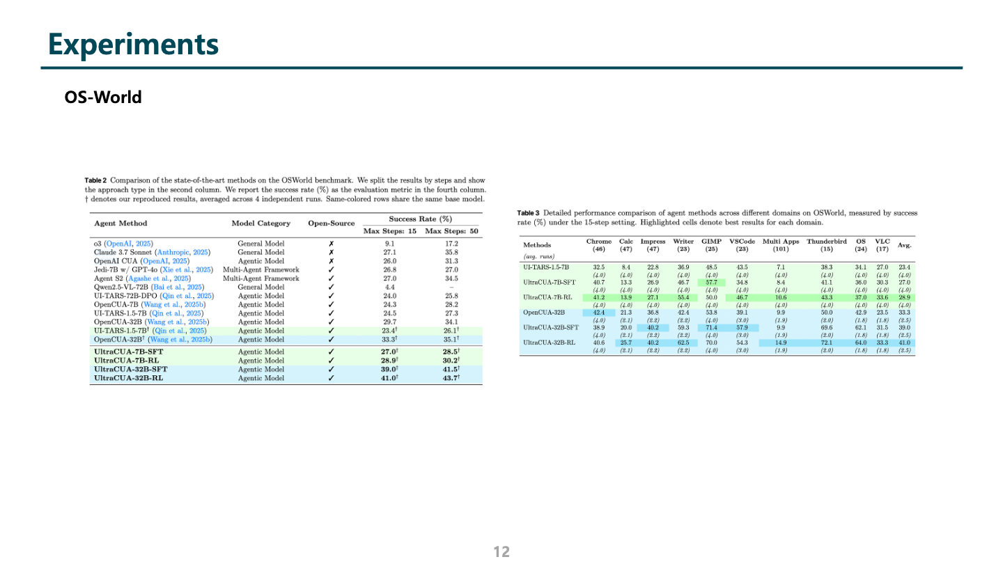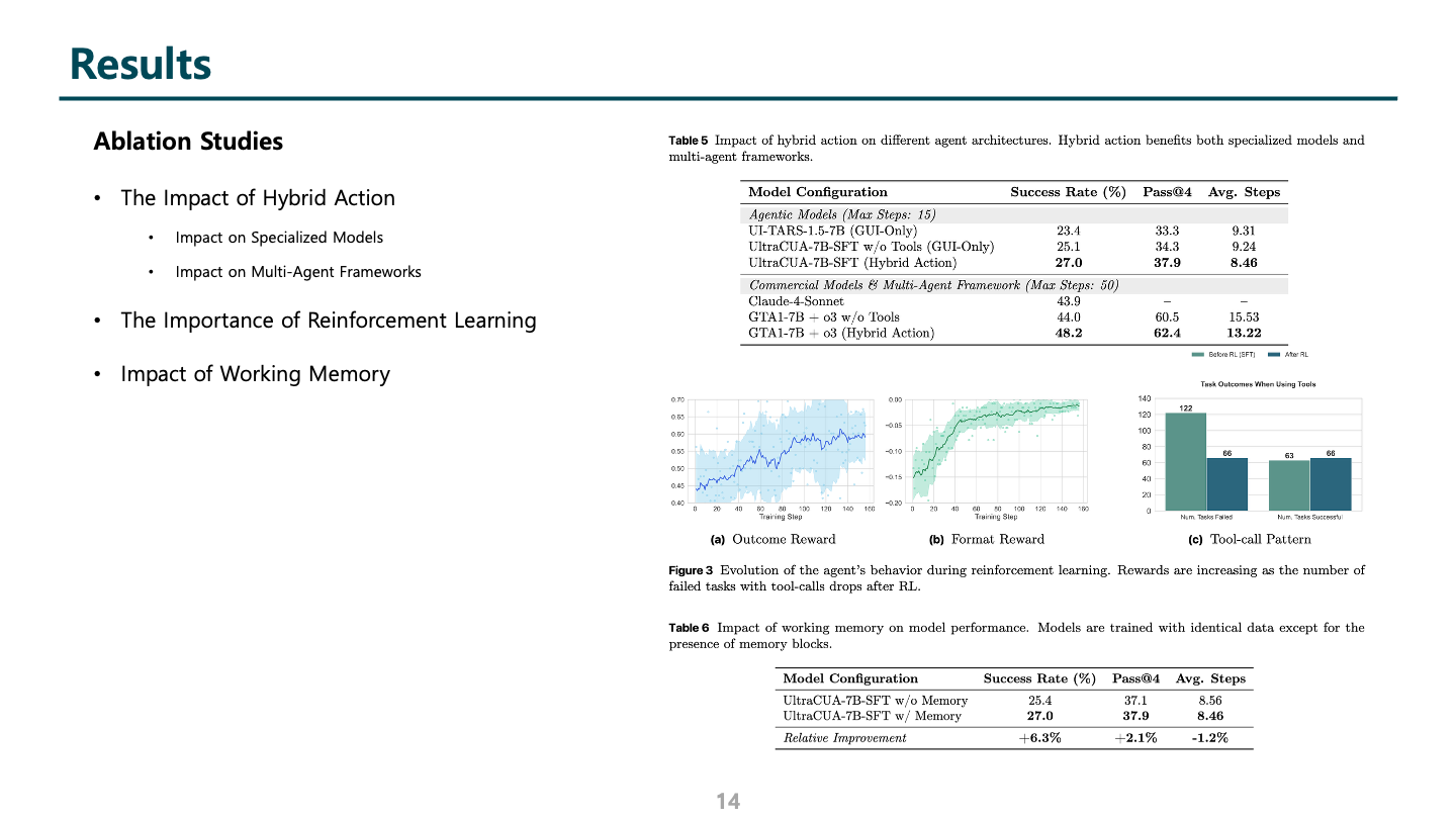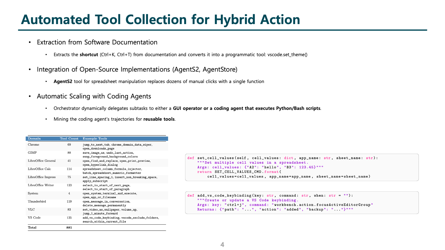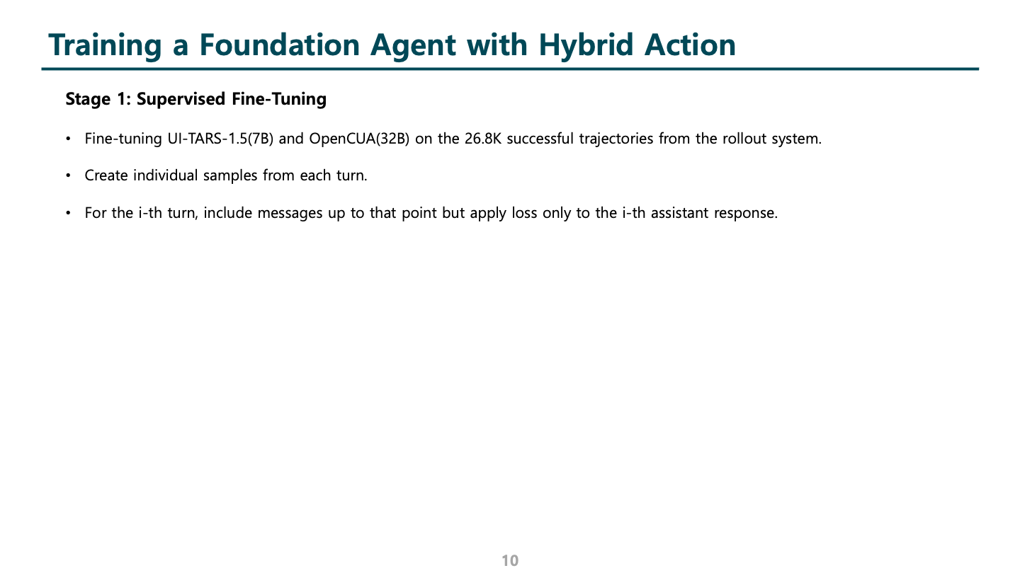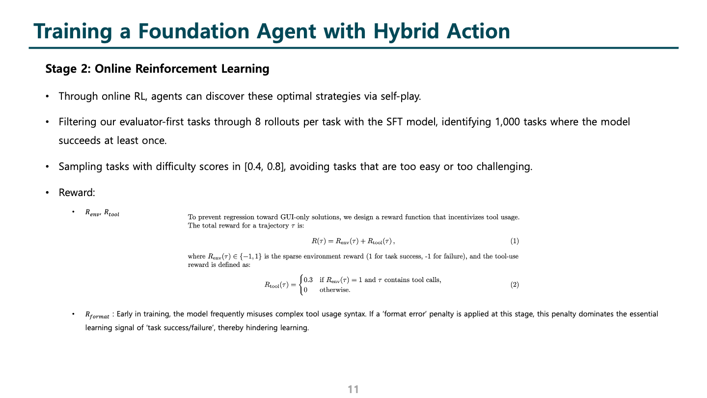 Multi-Modal [2025-2] 백승우 - UltraCUA: A Foundation Model for Computer Use Agents with Hybrid Action BaekDaBang 2025. 10. 29. 14:29 UltraCUA: A Foundation Model for Computer Use Agents with Hybrid Action Multimodal agents for computer use rely exclusively on primitive actions (click, type, scroll) that require accurate visual grounding and lengthy execution chains, leading to cascading failures and performance bottlenecks. While other agents leverage rich arxiv.org
