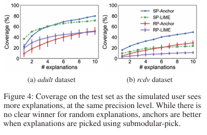 LIME과 anchor는 validation set을 통해서 구조화되고 test set에 대해서 precision(얼마나 설명되는가)과 coverage(예측 중 얼마나 맞았는가)를 평가함