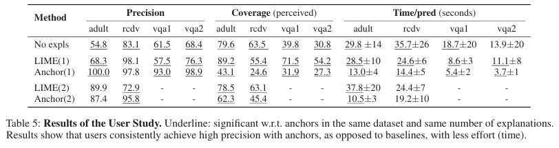 user study에서는 기존 선형 explanations에 비해 anchors가 users들이 어떻게 모델이 unseen instances에서 행동하는 지를 적은 노력과 높은 precision으로 예측할 수 있게 해줌