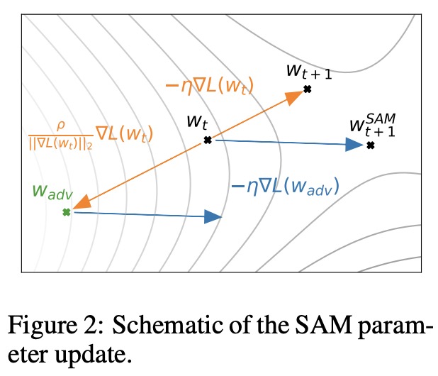 Wadv 지점에서 새로 계산된 그래디언트가 파란색 화살표이고, 그 방향대로 Wt를 업데이트 하면 더 평평한 지점인 Wsam_{t+1}에 도달하게 된다.