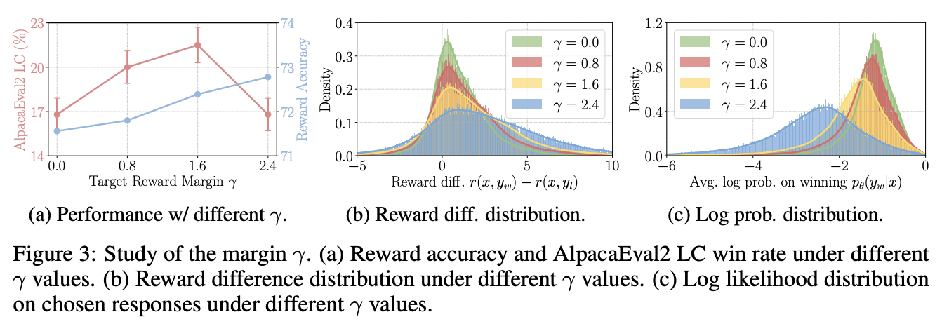 아래의 Figure 3a에서 reward margin $\gamma$의 크기에 따른 AlpacaEval2 benchmark에서의 win rate와 reward accuracy의 관계를 확인할 수 있다. $\gamma$의 값이 커짐에 따라 reward accuracy가 증가하고, win rate는 증가하다가 감소한다. 즉 일반적으로 $\gamma$의 값이 커질수록 reward의 정확도가 높아지지만, reward margin $\gamma$ 값만이 정확도에 영향을 미치는 것은 아니다.