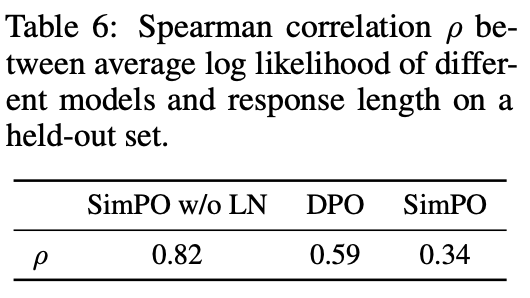 위의 Figure 2b와 2c에서는 SimPO와 SimPO without LN으로 생성한 prompt $x$에 대한 답변 $y$에 대해, 답변의 길이 $|y|$와 Average log probability $p_\theta(y|x) = \frac{1}{|y|} \log \pi_\theta (y|x)$의 축에 표시를 하였다. 결과적으로 SimPO without LN의 경우 SimPO 모델보다 훨씬 높은 Spearman correlation을 확인할 수 있었다. SimPO의 경우 SFT 모델과 유사한 Spearman correlation 계수를 보였다.