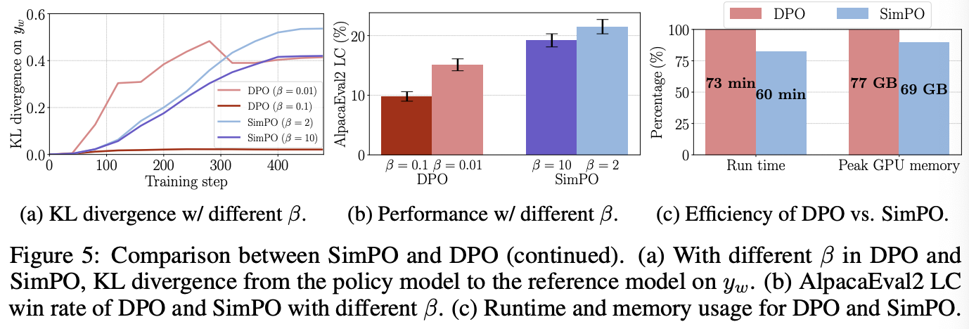 위의 Figure 5c에서 확인할 수 있듯이 SimPO는 DPO와 비교했을 때 컴퓨팅자원을 덜 소모한다.