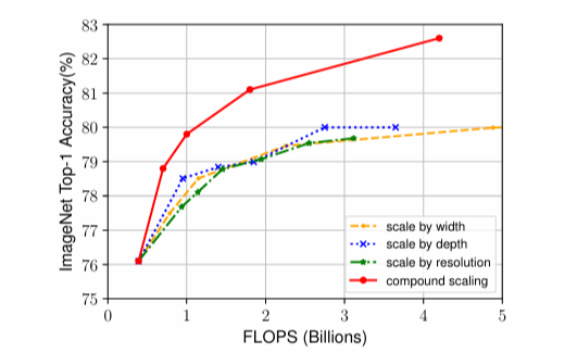 위의 결과값을 통해 여러 차원의 요소들이 같이 증가할 때 더 효율적으로 정확도를 높일 수 있음을 알 수 있습니다.