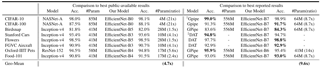 가장 높은 정확도를 가지고 있는 GPipe 모델에 비해 파라미터 수는 8.4배 FLOPS는 6.1배 적게 같은 성능을 발휘했으며,