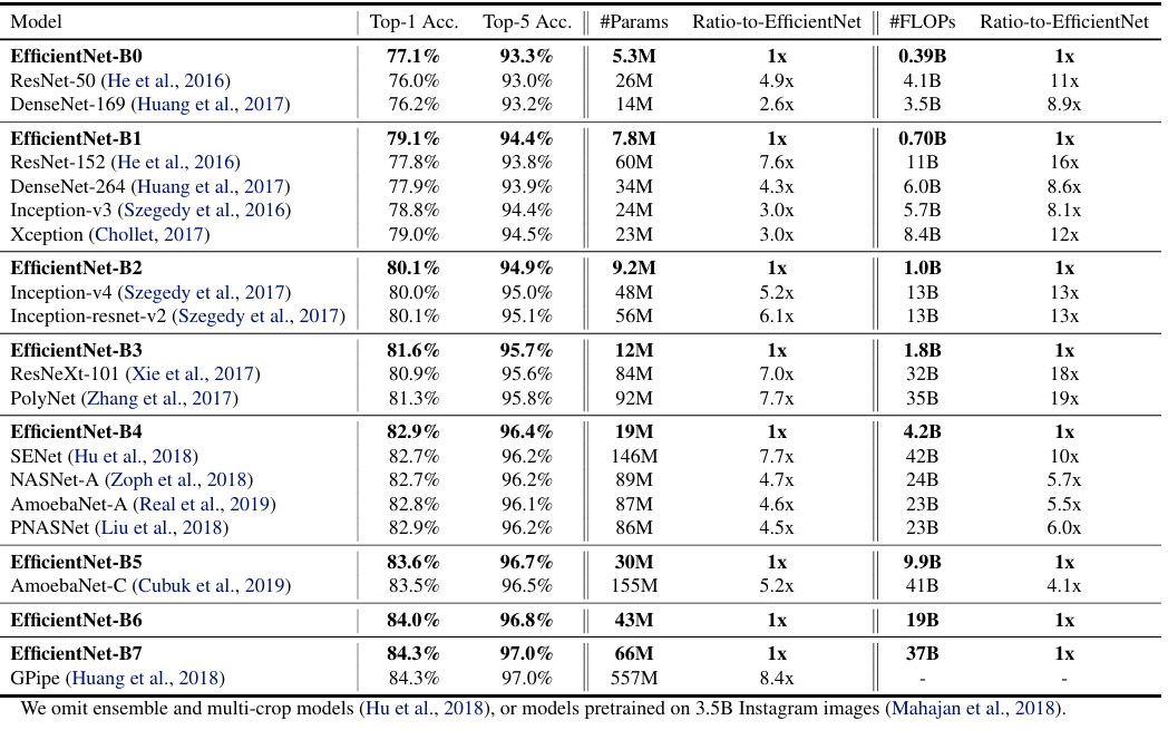 이를 통해 EfficientNet과 스케일링은 범용적인 데이터셋에서 낮은 FLOPS로 높은 정확도를 얻어내기 위한 효과적인 방법임을 알 수 있습니다.