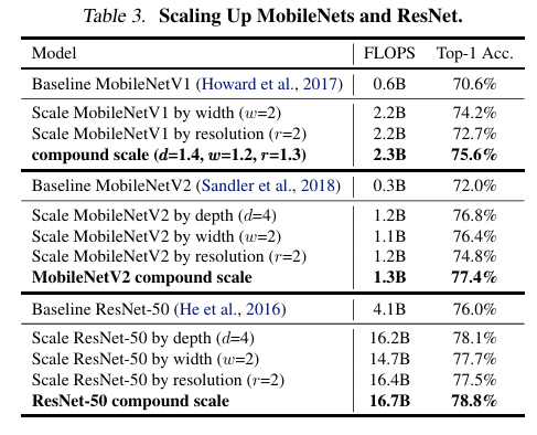 각 요소 간의 균형적인 상승이 EfficientNet에서만 작동한다는 것이 아닌 것을 증명하기 위해 MobileNetV1, MobileNetV2, ResNet-50에서도 스케일링 업을 진행하고 정확도와 FLOPS를 측정하였습니다.