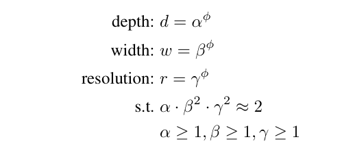φ라는 새로운 상수를 기준으로 스케일링을 진행합니다. 이러한 2^φ는 α*β^2*γ^2에 비례하는 것을 알 수 있는데, 이는 깊이가 2배 증가하면 FLOPS는 2배 증가하지만 채널수와 해상도가 2배 증가하면 채널수는 입력 채널(2배)* 출력채널(2배)로 4배, 해상도는 가로(2배)*세로(2배)로 4배 증가하므로 2^φ ≒ α·β^2·γ^2임을 알 수 있고, 이는 FLOPS가 d*w^2*r^2에 비례함을 나타냅니다.
