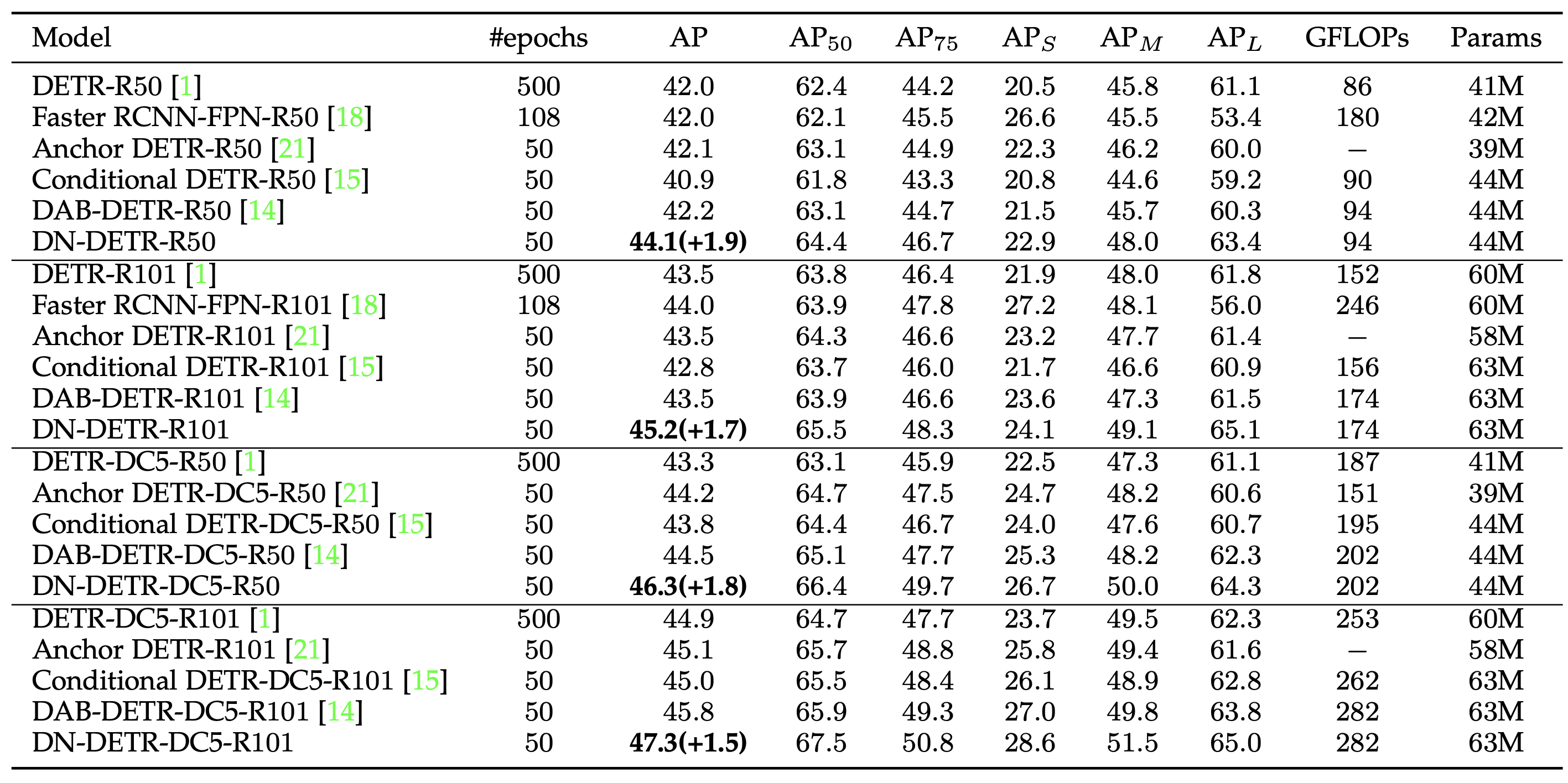DN-DETR은 디코더 쿼리를 박스와 레이블 임베딩으로 명시적으로 해석하고, bounding box와 class label 모두에 대해 denoising 학습을 도입한다. 또한 본 방법의 범용성을 보이기 위해 Deformable DETR 등 다른 DETR 계열 모델에도 denoising 학습을 적용했다. 실험 결과, denoising 학습은 학습 수렴을 유의미하게 가속화할 뿐만 아니라 탐지 성능 또한 향상시키며, ResNet-50 및 ResNet-101 백본을 사용하는 1×(12 epochs) 설정에서 기존 방법들 대비 최고의 성능을 달성하였다.