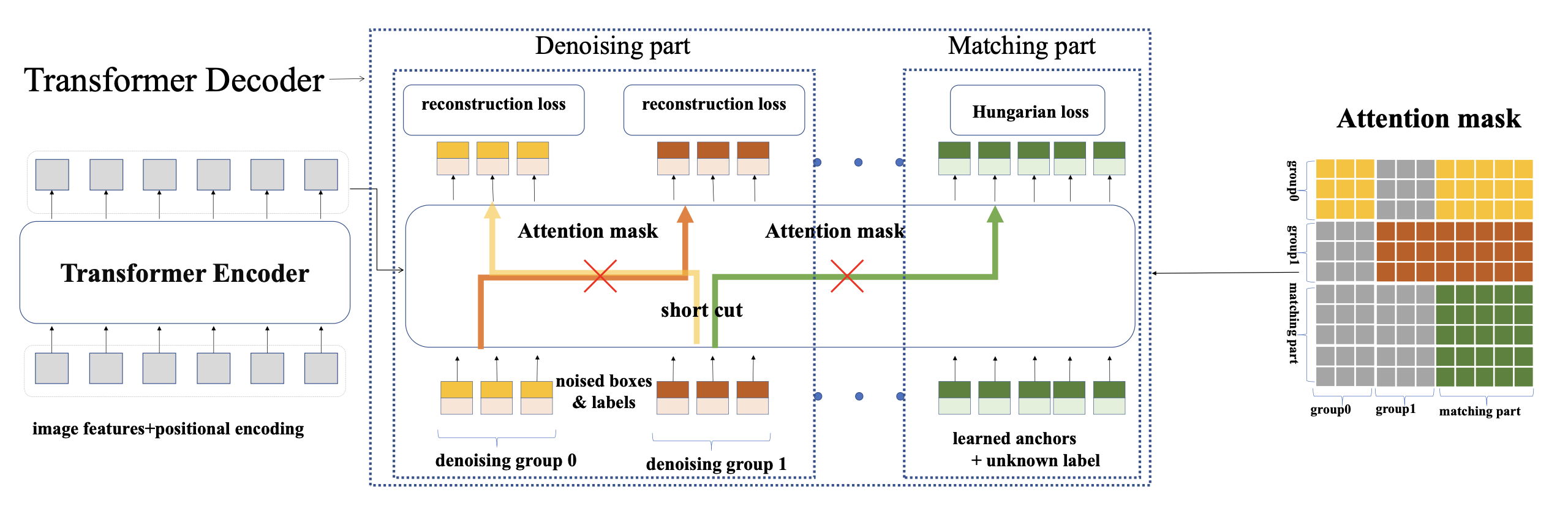 즉, 이를 방지하기 위해 attention mask는 matching 부분이 denoising 부분을 보지 못하게 하고, 서로 다른 denoising group 간의 attention을 차단하도록 설계된다.