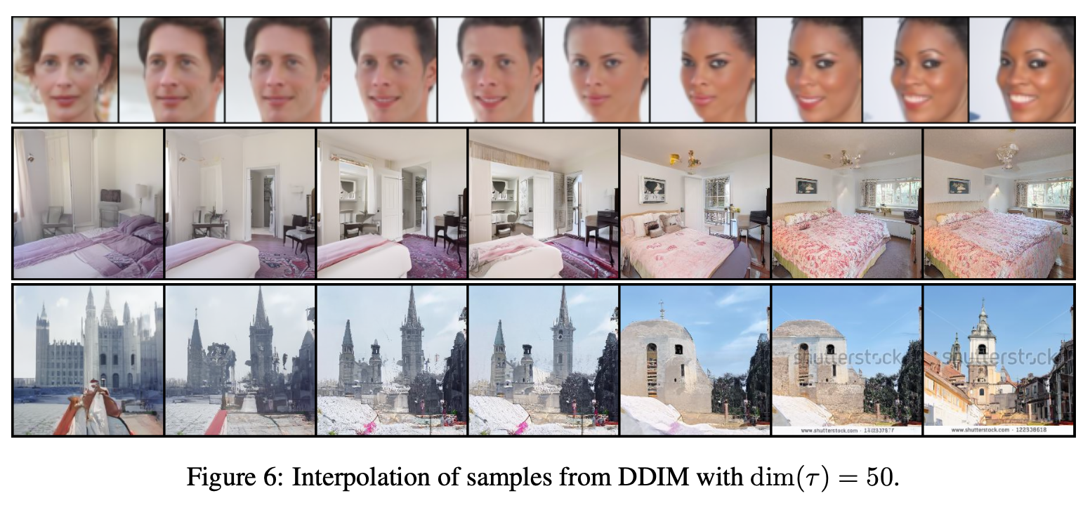 Figure 6은 DDIM이 latent space에서 의미 있는 interpolation을 수행할 수 있음을 보여준다. DDIM에서는 high-level semantic 정보가 초기 latent $x_T$에 인코딩되어 있으므로, 두 latent 사이를 선형 보간하면 생성 이미지 역시 자연스럽게 의미적으로 변화한다.