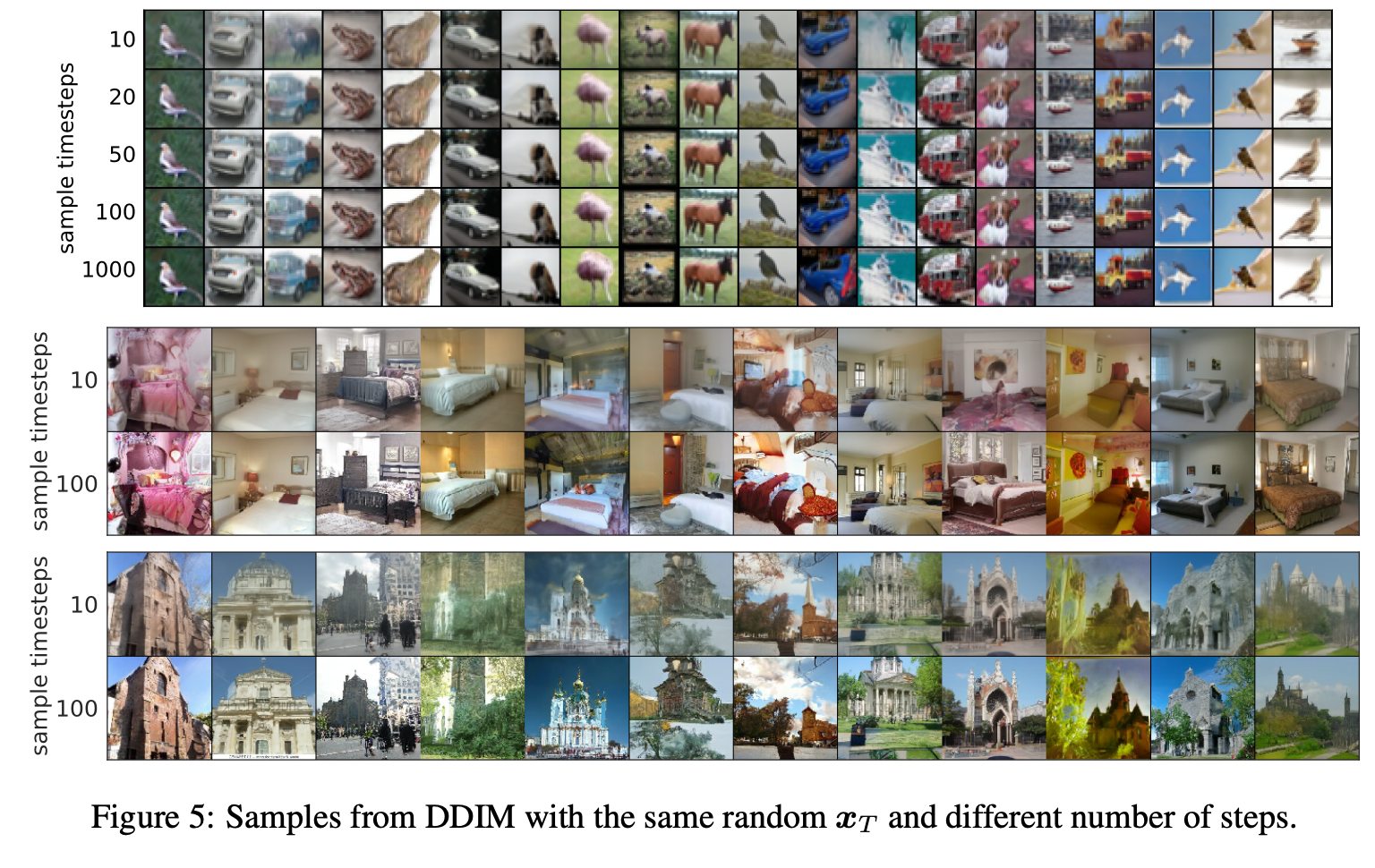 Figure 5는 DDIM의 가장 중요한 특성인 consistency를 보여준다. DDIM은 deterministic generative process이므로 $x_0$는 오직 초기 latent $x_T$에 의해 결정된다. 실제로 동일한 $x_T$에서 서로 다른 generative trajectory $\tau$를 사용해도 생성된 이미지의 high-level 구조는 거의 동일하게 유지된다.