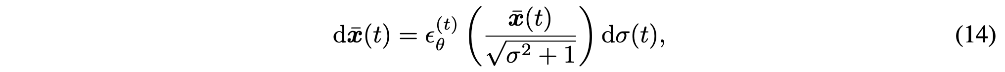 식 (13)은 DDIM의 discrete update를 재정리한 것으로, 이를 적절히 재파라미터화하면 연속 시간에서의 미분 방정식 형태인 ODE (식 (14))로 해석할 수 있다. 즉, DDIM의 deterministic sampling은 사실상 특정 ODE를 Euler 방식으로 적분하는 과정과 동일하다.