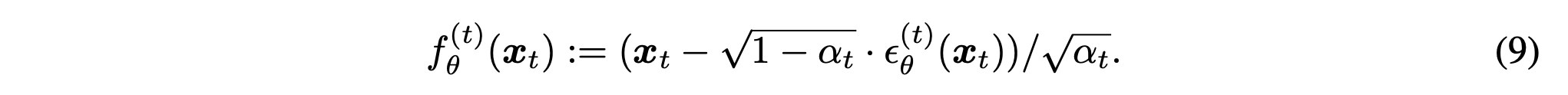 식 (9)는 noisy한 $x_t$로부터 원본 $x_0$을 복원하는 식이다. 모델은 먼저 $x_t$에 포함된 노이즈 $\epsilon$을 예측하고, forward 식 $x_t = \sqrt{\alpha_t}x_0 + \sqrt{1-\alpha_t}\epsilon$을 역으로 정리하여 $x_0$의 추정값 $f_\theta^{(t)}(x_t)$을 계산한다. 즉, 이 식은 노이즈 예측을 원본 복원으로 연결하는 역할을 한다.