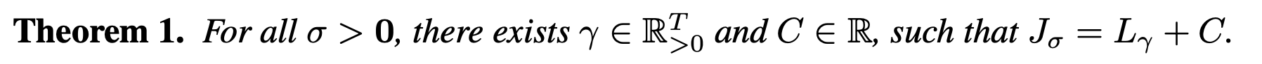 Theorem 1의 핵심은, 앞서 정의한 variational objective $J_\sigma(\epsilon_\theta)$가 특정 가중치 $\gamma$와 상수 $C$에 대해 $J_\sigma = L_\gamma + C$로 표현될 수 있다는 점이다. 즉, non-Markovian forward를 사용해 새롭게 정의한 generative process에 대응하는 objective 역시, DDPM에서 사용하는 noise prediction objective $L_\gamma$와 본질적으로 동치라는 의미다. 특히 모델의 각 시점별 파라미터 $\epsilon_\theta^{(t)}$가 서로 공유되지 않는다면, $L_\gamma$의 최적해는 가중치 $\gamma$에 의존하지 않으며, 결과적으로 $J_\sigma$의 최적해 또한 기존 DDPM에서 사용하는 $L_1$ objective와 동일해진다. 이는 forward 구조를 일반화하더라도 학습 자체는 기존 DDPM과 완전히 동일하게 수행할 수 있음을 보장한다.
