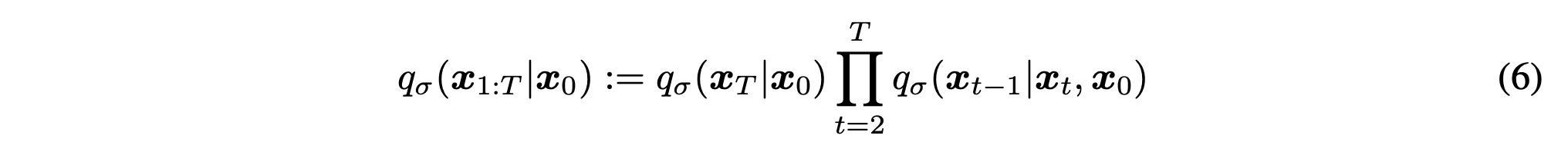 식 (6)은 새로운 inference joint 분포를 정의하는 식이다. 기존 DDPM에서는 $q(x_t \mid x_{t-1})$형태의 Markov chain을 사용했지만, 여기서는 $q_\sigma(x_{t-1} \mid x_t, x_0)$처럼 $x_0$까지 조건에 포함시킨다. 즉, forward joint를 Markov 구조에서 벗어나 non-Markovian 구조로 재정의하는 단계다.