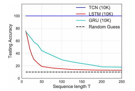 Sequence의 길이가 증가함에 따라 TCN은 정확도가 100%로 유지되는 반면 recurrent 모델들은 random guess와 비슷한 수준으로 빠르게 감소하는 것을 알 수 있습니다.
