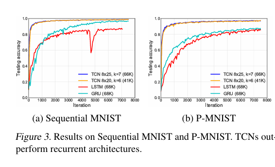 MNIST에서도 역시 모든 모델들의 파라미터를 70k로 설정하고 실험을 진행하였을 때 TCN이 recurrent 모델들을 능가하는 성능을 보였음을 알 수 있습니다.