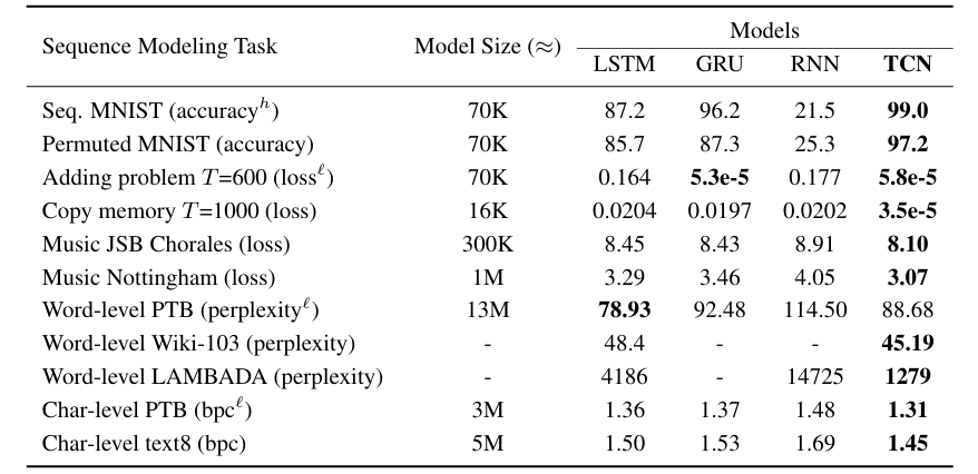 사람들은 일반적으로 RNN이 sequential data를 다룰 때 더 우수할거라 생각합니다. 하지만 이 연구팀에서는 TCN에서 이용한 convolution 모델 만으로도 LSTM이나 GRU보다 우수한 성능의 장기 기억 전파를 할 수 있다는 것을 실험적으로 밝혀냈습니다.