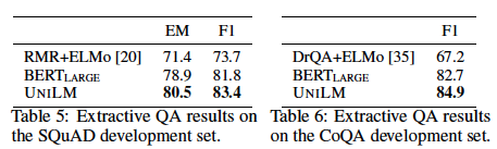 - EM(Exact Match)와 F1 점수를 비교해 본 결과 두 경우 모두 UniLM이 가장 좋은 결과를 보이는 것을 확인할 수 있음
