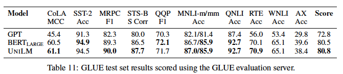 - NLU 작업에서, UniLM을 BERT와 같이 bidirectional Transformer encoder로 fine-tuning