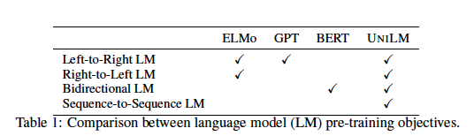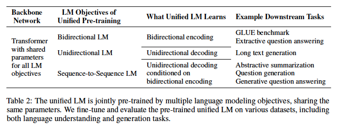 - UniLM은 다층의 Transformer network로 많은 양의 텍스트가 함께 pre-training 되었으며 Table 2에서 볼 수 있듯 3가지 유형의 비지도 LM 목표에 최적화됨