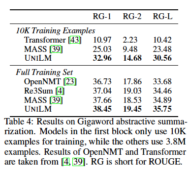 - Table 4는 Gigaword abstractive summarization에 대한 평가 결과로 UniLM이 가장 뛰어난 결과를 보임을 확인할 수 있음