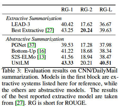 - Table 3은 CNN/DailyMail의 요약에 대한 평가 결과로 UniLM이 Abstractive Summarization에서 가장 뛰어난 결과를 보임을 확인할 수 있음