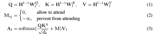 - l번째 Transformer layer에서 self-attention head A_l은 아래와 같은 방법을 통해 계산