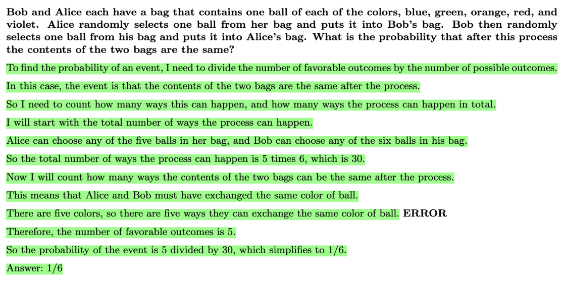 - 생성기가 Step 9에서 계산 오류를 범했으나 보상 모델이 이 오류에 속은(녹색) 문제