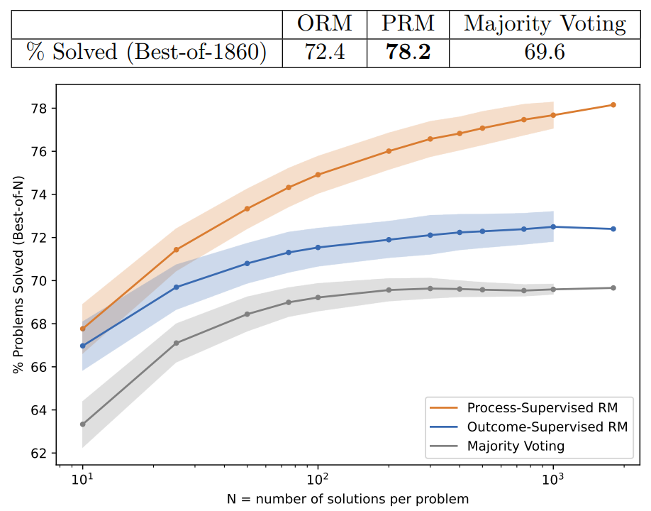 - ORM(결과 감독 모델): 최종 정답 여부(Correct/Incorrect)만으로 학습된 모델이다. PRM보다 더 많은 샘플(문제당 100개)로 학습시킨 가장 강력한 형태의 ORM을 비교 대상으로 삼아 평가했다.